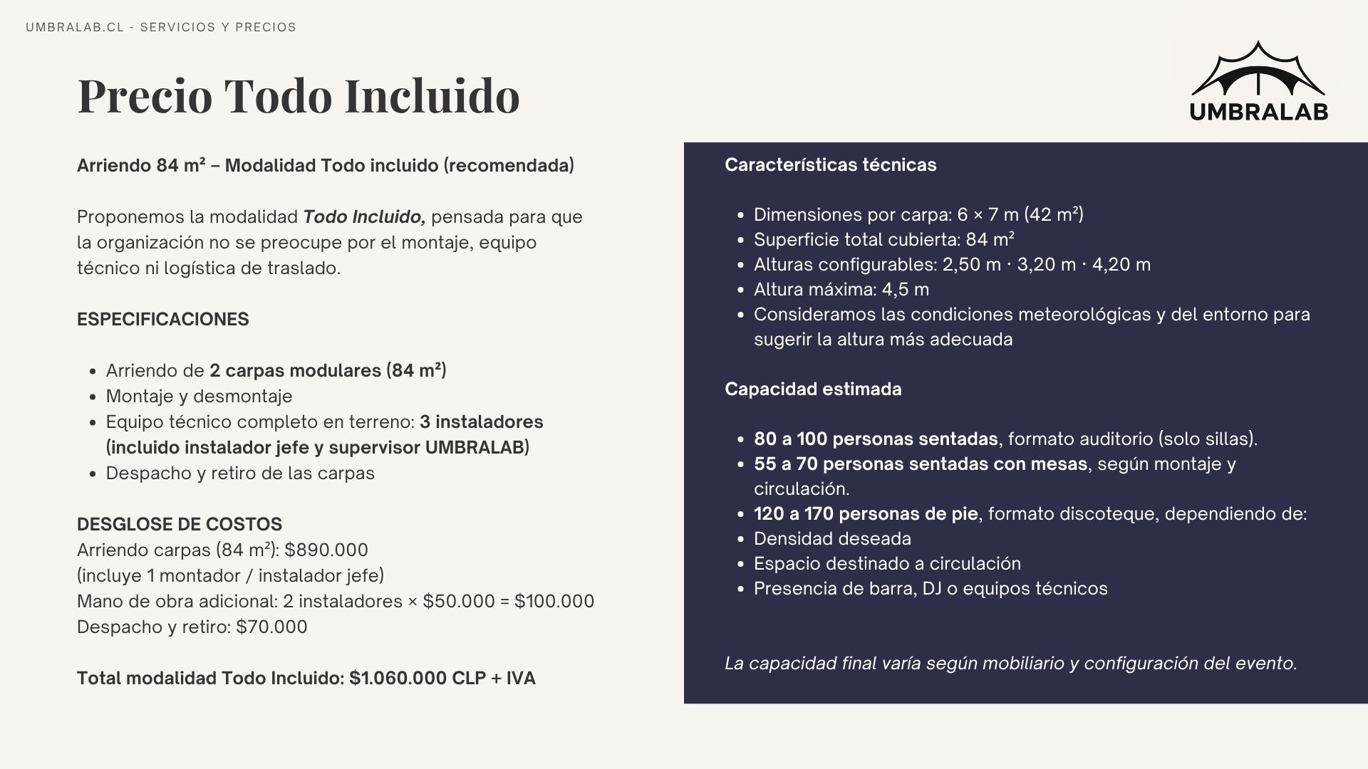Escribenos con las características de tu proyecto. Recibirás todos los detalles, precios y logística para que tu evento sea un éxito.