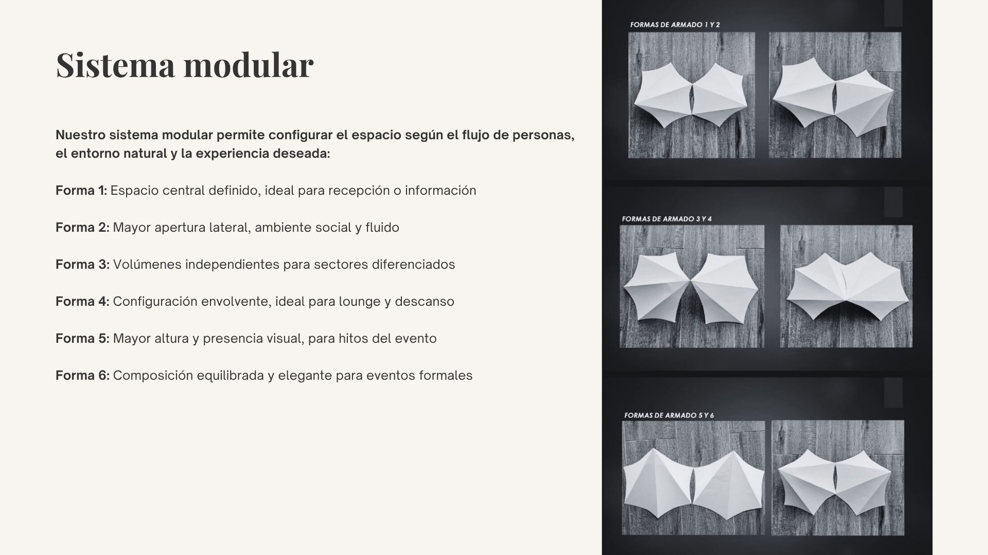Nuestro sistema modular permite configurar el espacio según el flujo de personas, el entorno natural y la experiencia deseada: Forma 1: Espacio central definido, ideal para recepción o información Forma…